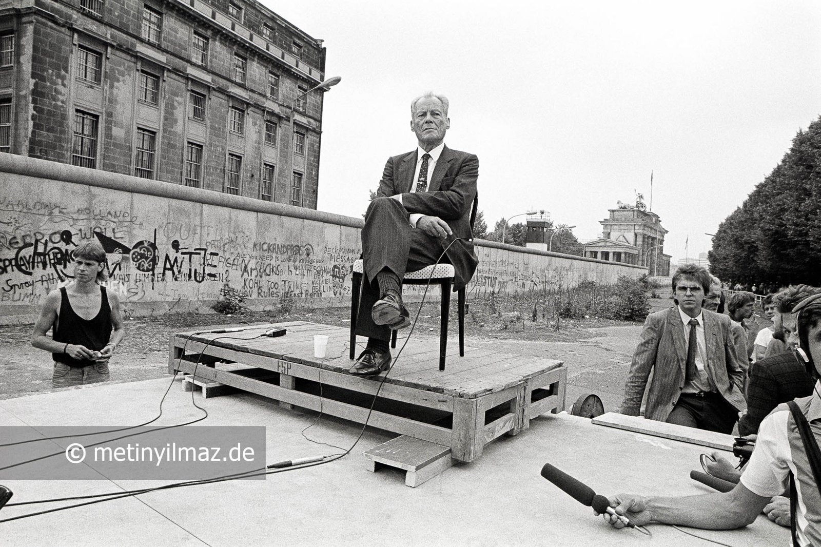 Berlin, 13.08.1986 - Am 25. Jahrestag der Errichtung der Berliner Mauer führt ein amerikanischer Fernsehsender hinter dem Reichstagsgebäude ein Live-Interview mit Willy Brandt durch. Der Bereich hinter dem Reichstagsgebäude ist abgesperrt. Ein Studio mit Live-TV-Kameras wurde aufgebaut, die Szene mit Kinoscheinwerfern ausgeleuchtet. Die Berliner Mauer und das Brandenburger Tor sollen mit im TV-Bild erscheinen. Eine Europalette und Holzklötze dienen der Feinjustierung des Bildausschnitts. Auf dem Foto sind neben Willy Brandt noch Techniker, Journalisten und Bodyguards zu sehen, im Hintergrund die Berliner Mauer und das Brandenburger Tor.
