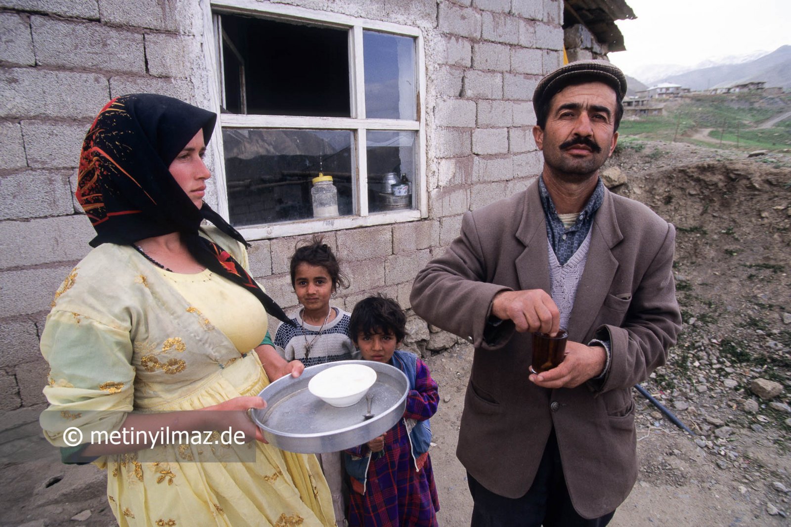 HAKKARI, TÜRKEI - 19.05.1996: Eine kurdische Familie, die ihr Dorf im Grenzgebiet verlassen und in die Stadt Hakkari, eine Grenzstadt im Dreiländereck Türkei-Irak-Iran, ziehen musste, steht vor ihrem neuen Haus. In Hakkari stellen die Kurden die Bevölkerungsmehrheit. © Foto: metinyilmaz.de
